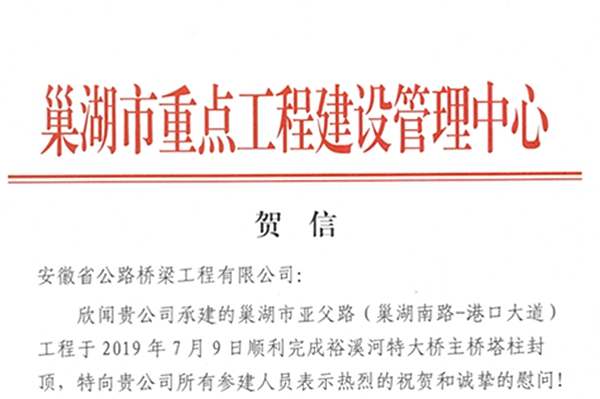 近日,巢湖市重點(diǎn)工程建設(shè)管理中心向公司發(fā)來賀信,對(duì)公司承建的巢湖市亞父路(巢湖南路-港口大道)工程在7月9日順利完成裕溪河特大橋主橋塔柱封頂表示熱烈祝賀和誠摯慰問。