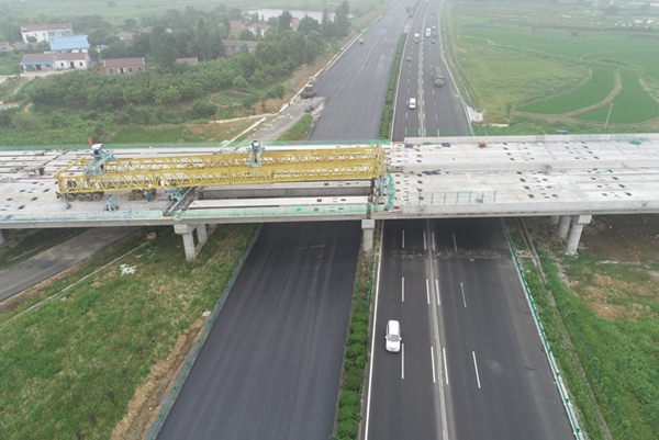 上跨G3京臺(tái)高速分離立交橋?yàn)樯娓咚偈┕?所跨路段日均車(chē)流量達(dá)五萬(wàn)多輛,并與正在進(jìn)行的高速改擴(kuò)建瀝青攤鋪交叉施工,需要在規(guī)定的半幅封閉時(shí)間內(nèi)完成上跨梁板架設(shè)任務(wù),施工環(huán)境復(fù)雜,組織難度較大。經(jīng)過(guò)多次專(zhuān)家論證,項(xiàng)目不斷優(yōu)化施工方案,并堅(jiān)持責(zé)任到人,狠抓時(shí)間節(jié)點(diǎn),有效克服了各項(xiàng)困難,梁板架設(shè)有序推進(jìn),順利實(shí)現(xiàn)了上跨高速橋的順利合龍。