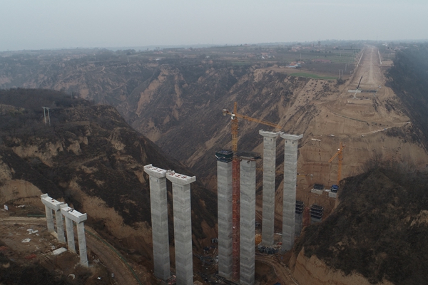 新城溝大橋作為項目控制性工程,長度不到400m的深溝內(nèi)作業(yè)面狹小,附近便道又陡又窄,人員、機械、材料運輸困難,溝中的10個空心薄壁墩最高達(dá)到78米。為做到“又好又快”施工,技術(shù)人員經(jīng)過調(diào)查和方案比選,采用翻模施工工藝與高墩自動噴淋養(yǎng)生技術(shù),在保證工期的同時做到墩身外觀質(zhì)量及實體強度滿足設(shè)計要求。過程中,大家克服數(shù)道難關(guān),鉚足了勁與時間賽跑,提前完成橋梁下構(gòu)施工任務(wù),為后續(xù)架梁和橋面系施工贏得了有效時間。