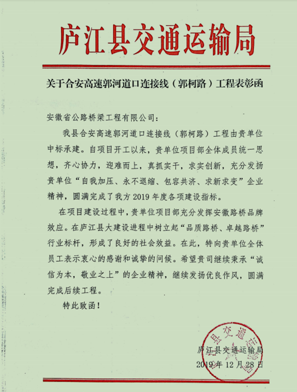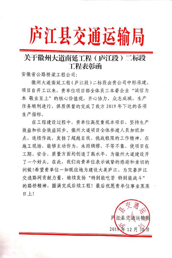 近日,公司收到廬江縣交通運輸局寄來的表揚信,對徽州大道南延工程(廬江段)二標段、湯池大道建設工程(合銅路至郭河段)二期及合安高速郭河道口連接線(郭柯路)工程等三個項目積極克服各類困難,高標準、嚴要求推進施工生產(chǎn)給予表揚和感謝。