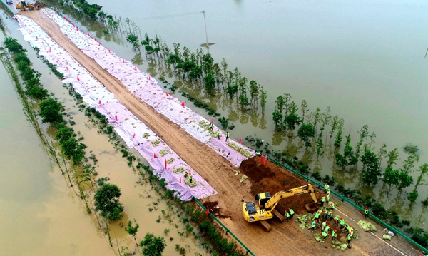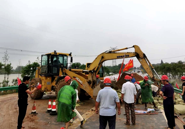 7月23日下午5時(shí),石頭鎮(zhèn)水位上漲迅猛,廬江縣重要防汛通道X092線150米漫水公路淹沒,嚴(yán)重威脅當(dāng)?shù)厝罕娚钜约胺姥闯鲂??;罩荽蟮理?xiàng)目迅速行動(dòng),組織人員70余人,機(jī)械數(shù)十臺(tái),挖土2000方,裝填沙袋5000只,構(gòu)筑起兩道安心墻。
