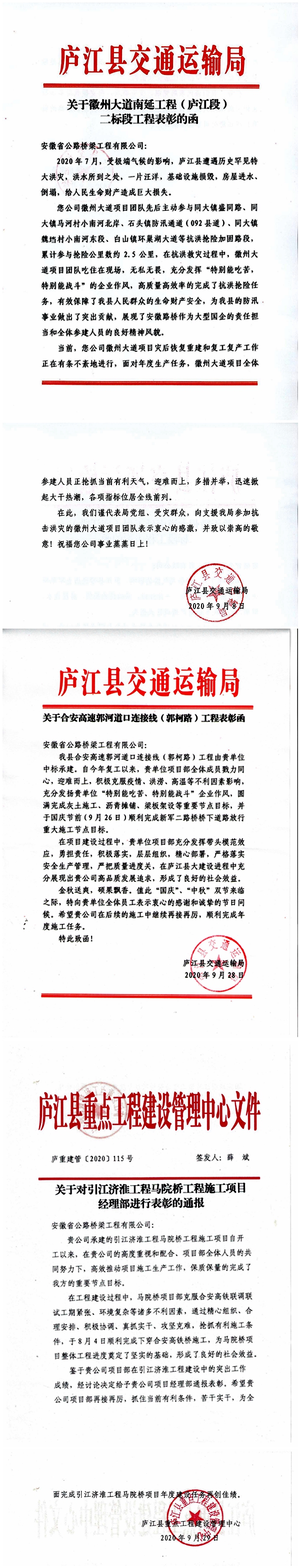 近日,廬江縣交通運輸局、廬江縣重點工程建設(shè)管理中心先后發(fā)來表彰信,對公司承建的徽州大道南延工程(廬江段)二標段、合安高速郭河道口連接線(郭柯路)工程、引江濟淮馬院橋工程項目戰(zhàn)疫情、抗洪水、搶進度、樹形象,高標準、高質(zhì)量推進施工生產(chǎn)給予表揚和感謝。