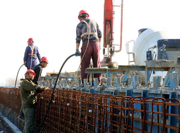 固蚌高速02標,春節(jié)期間加班加點推進工程建設,在南岸引橋右幅順利實現(xiàn)貫通后,170名參建人員搶抓晴好天氣,保持大干勢頭,同步推進四個工區(qū)橋面作業(yè),架橋機、履帶吊等機械滿載開工,為3月底達成橋面工程節(jié)點奠定堅實基礎。蕪黃項目再動員、再鼓勁,人員輪休、機械不停,荊竹坑大橋、程家坦隧道及附屬工程穩(wěn)步推進,2#預制梁場每天以8片梁速度加速生產(chǎn),全力沖刺半幅通車節(jié)點目標。