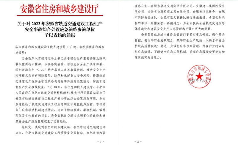 近日,安徽省住房和城鄉(xiāng)建設(shè)廳發(fā)文通報(bào)表揚(yáng)安徽建工集團(tuán)控股有限公司、安徽省公路橋梁工程有限公司在2023年度安徽省軌道交通建設(shè)工程綜合處置應(yīng)急演練中所作出的突出貢獻(xiàn)和優(yōu)異表現(xiàn)。