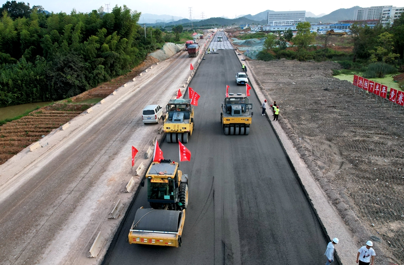 路基施工在艱難中一天一個樣地推進(jìn)。為保質(zhì)保量履約,項(xiàng)目在用地批復(fù)后迅速開始道路清表和土方填筑施工,以“勇當(dāng)先鋒”的姿態(tài)搶抓進(jìn)度,增加雙倍設(shè)備,隊(duì)伍人員實(shí)行“白+黑”分班作業(yè),晝夜不停加緊施工。各部門和現(xiàn)場各個作業(yè)面始終保持著有序銜接,解決困難及時(shí),人機(jī)穿梭有序。經(jīng)過共同努力,項(xiàng)目僅用不到60天時(shí)間就完成標(biāo)尾路基施工任務(wù),提前20天進(jìn)入路面基層試驗(yàn)段攤鋪??h領(lǐng)導(dǎo)多次到項(xiàng)目調(diào)研,對現(xiàn)場進(jìn)展表示肯定,并給予“全力以赴保工期,以實(shí)際行動展現(xiàn)國企速度”的評價(jià),項(xiàng)目也接連受到業(yè)主單位通報(bào)表揚(yáng)。
