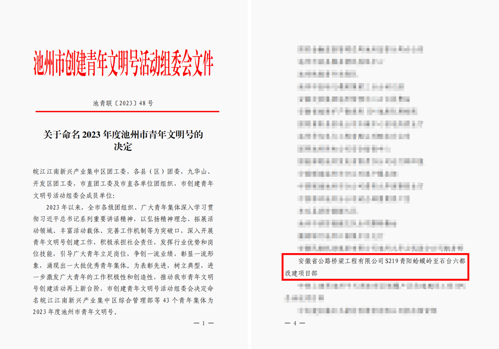 12月7日,池州市青年文明號(hào)風(fēng)采展示暨授牌儀式成功舉辦,現(xiàn)場(chǎng)公布了獲評(píng)2023年度池州市青年文明號(hào)名單,公司承建的S219青陽(yáng)改建工程項(xiàng)目喜獲殊榮。