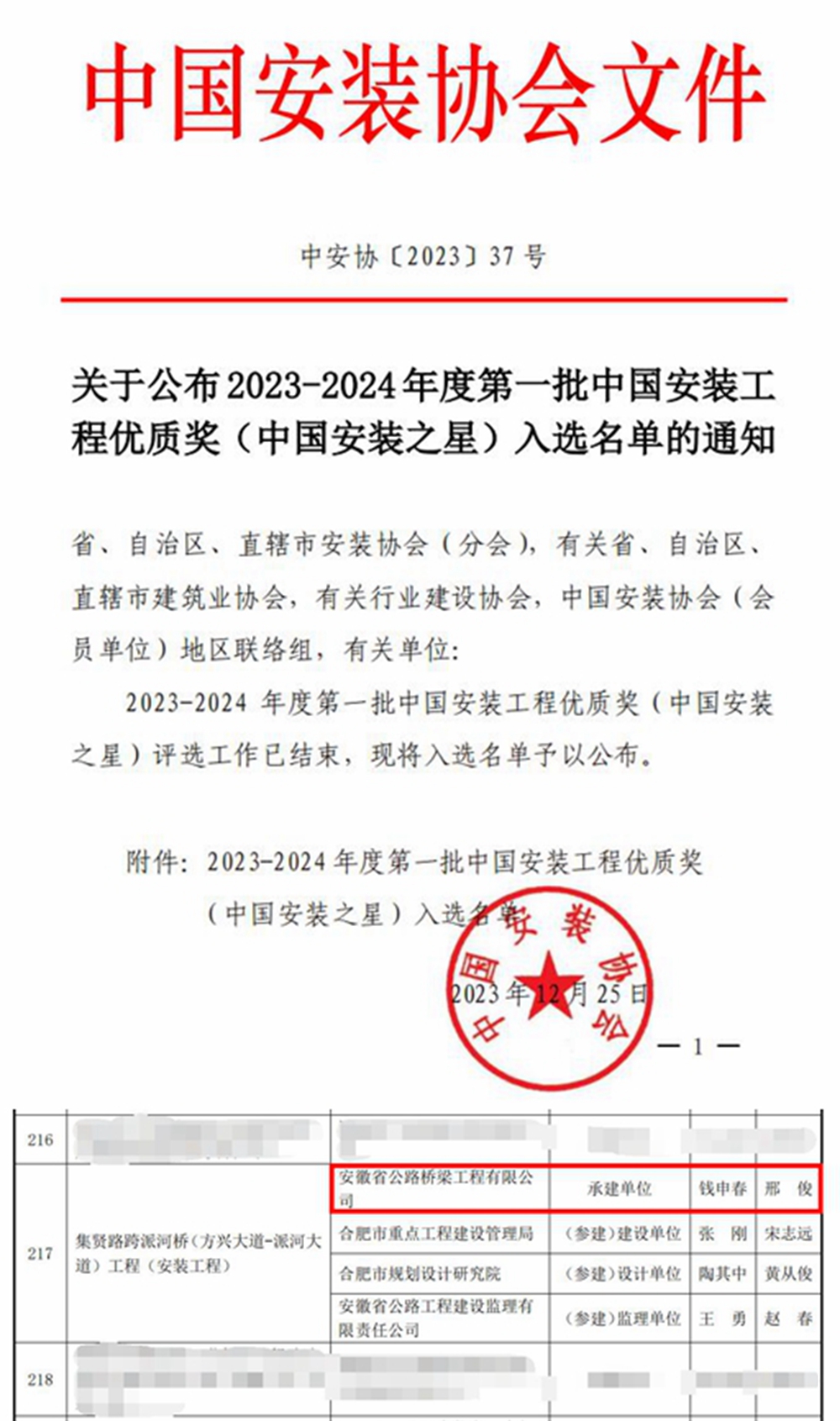 12月25日,中國安裝協(xié)會公布了2023-2024年度第一批中國安裝工程優(yōu)質(zhì)獎(中國安裝之星)入選名單,公司承建的集賢路跨派河橋(方興大道-派河大道)工程榜上有名。此項目是中國安裝工程優(yōu)質(zhì)獎(中國安裝之星)歷年獲獎項目中首個市政橋梁項目,也是公司首個獲得中國安裝工程優(yōu)質(zhì)獎(中國安裝之星)的項目。