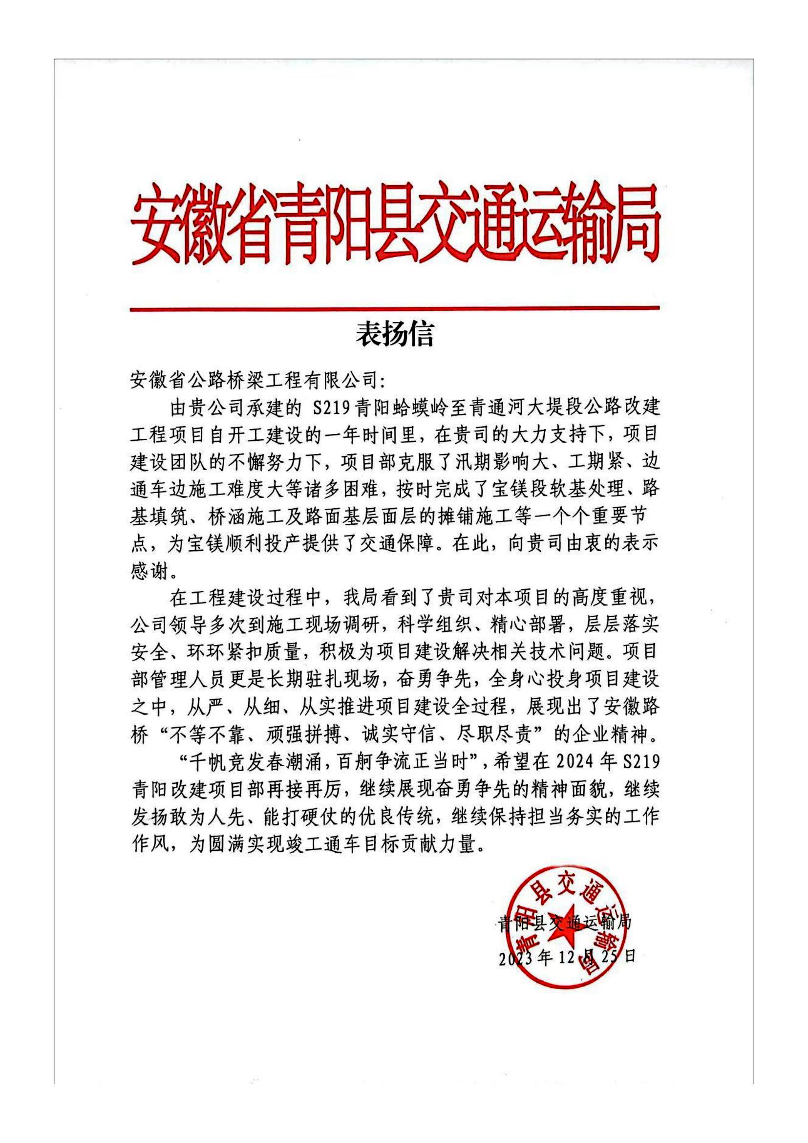 安徽省青陽縣交通運輸局和青陽縣旅游發(fā)展有限公司來信指出,S219青陽蛤蟆嶺至青通河大堤段公路改建工程項目建設過程中,項目施工管理團隊克服了汛期影響大、工期緊、邊通車邊施工難度大等諸多困難,高質量、高標準按期完成了各節(jié)點任務,為青陽交通運輸事業(yè)高質量發(fā)展做出了巨大貢獻。
