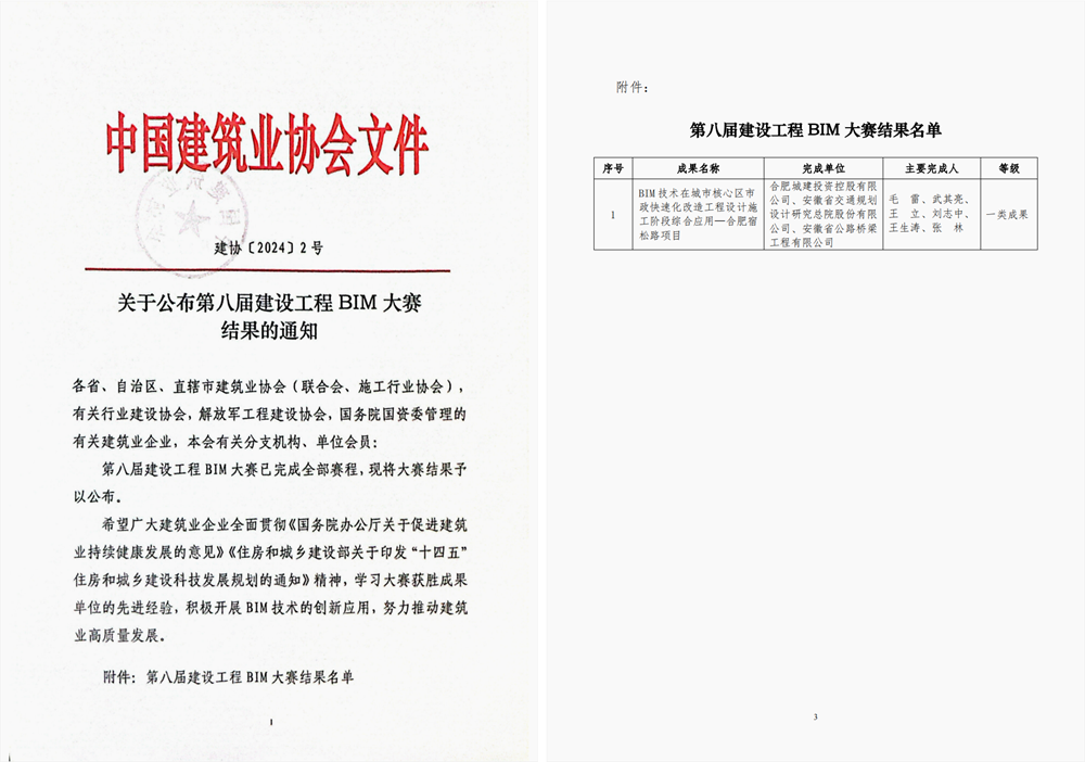 1月23日,中國(guó)建筑業(yè)協(xié)會(huì)發(fā)布了《關(guān)于公布第八屆建設(shè)工程BIM大賽結(jié)果的通知》,公司承建的宿松路6標(biāo)項(xiàng)目報(bào)送的“BIM技術(shù)在城市核心區(qū)市政快速化改造工程設(shè)計(jì)施工階段綜合應(yīng)用—合肥宿松路項(xiàng)目”榮獲一類成果。