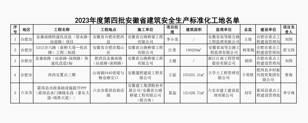 近日,安徽省建設(shè)工程質(zhì)量與安全協(xié)會(huì)公布2023年度第四批安徽省建筑安全生產(chǎn)標(biāo)準(zhǔn)化工地名單,由公司承建的金寨南路快速化改造(望水路-站前路)項(xiàng)目、G312合六路(新橋大道-侯店路)工程二標(biāo)段、金寨南路(站前路-深圳路)快速化改造1標(biāo)、霍邱縣市政基礎(chǔ)設(shè)施提升PPP(霍邱縣水門(mén)塘路東段(蓼東大道-靖淮大道))、肥西文旅西崗安置點(diǎn)三期等5個(gè)項(xiàng)目光榮上榜。