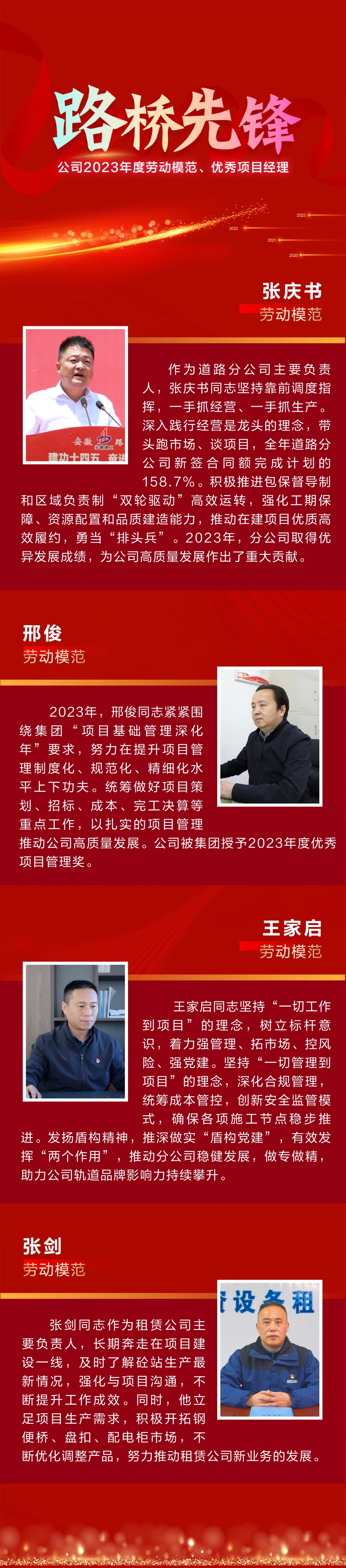 【路橋先鋒】公司2023年度勞動(dòng)模范、優(yōu)秀項(xiàng)目經(jīng)理風(fēng)采展示 發(fā)布時(shí)間:2024年03月18日 來(lái)源:黨委組織部(人力資源部、黨委宣傳部)、所屬各單位 發(fā)布人:黨委組織部(人力資源部、黨委宣傳部) 作者: 瀏覽:2495次