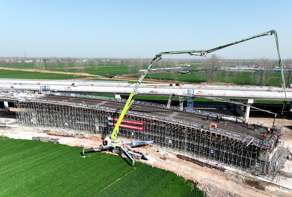 項(xiàng)目部提前謀劃部署,搶抓施工黃金時(shí)段,迅速組織路基工作面?zhèn)渫?,加?qiáng)勞務(wù)隊(duì)伍、機(jī)械設(shè)備和物資材料保障,在保證安全質(zhì)量的前提下,迅速投入到緊張的施工生產(chǎn)中。3月19日,順利完成渦陽(yáng)互通DK0+233.949匝道橋第二聯(lián)現(xiàn)澆箱梁頂板澆筑,至此,標(biāo)段內(nèi)現(xiàn)澆箱梁全部完成澆筑。