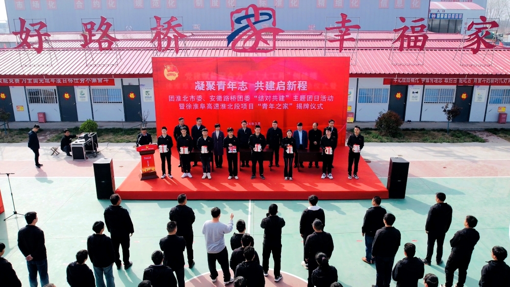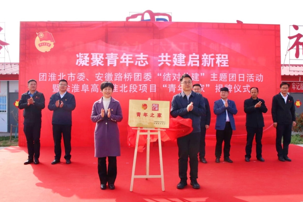 3月28日下午,團淮北市委、安徽路橋團委在徐淮阜高速(淮北段)項目聯(lián)合開展主題團日活動。團淮北市委書記陳文靖、副書記李凱,公司黨委委員、紀委書記王鵬出席活動并共同為徐淮阜高速淮北段項目“青年之家”揭牌。