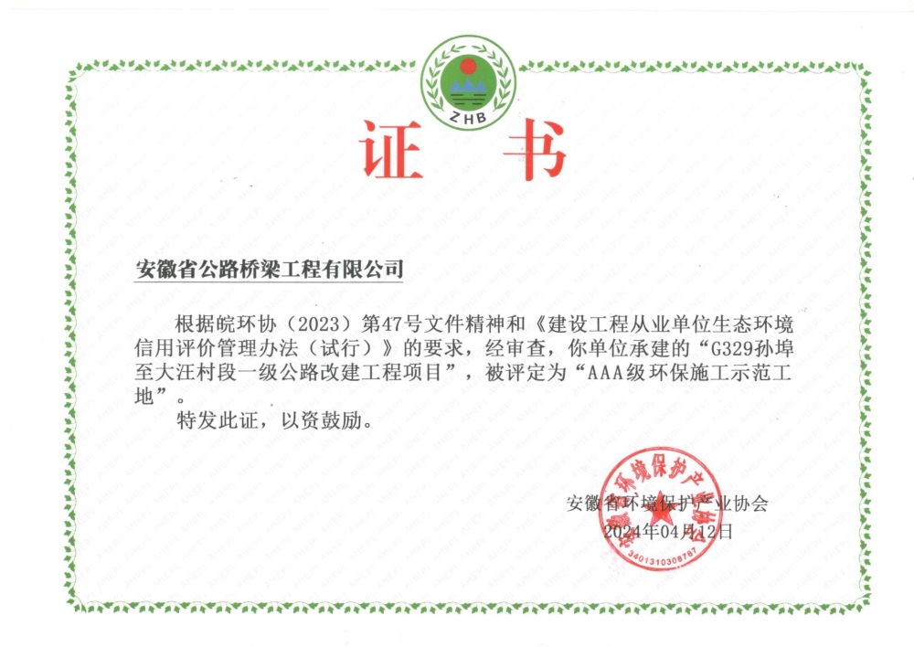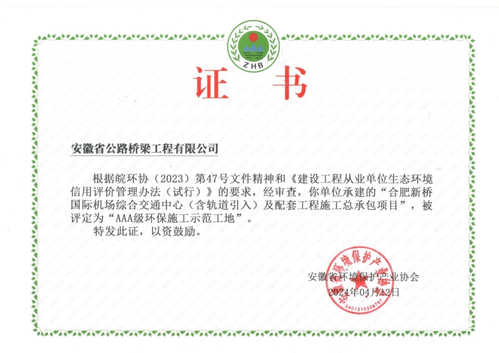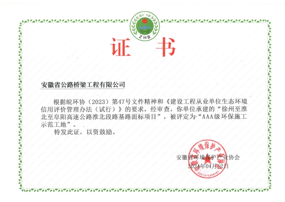 近日,安徽省環(huán)境保護(hù)產(chǎn)業(yè)協(xié)會(huì)公布了“2024年第2批建設(shè)工程從業(yè)單位生態(tài)環(huán)境信用評(píng)價(jià)結(jié)果”,由公司承建的徐州至淮北至阜陽高速公路淮北段路基路面標(biāo)、G329孫埠至大汪村段一級(jí)公路改建工程和合肥新橋國際機(jī)場綜合交通中心(含軌道引入)及配套工程施工總承包項(xiàng)目獲評(píng)安徽省“AAA級(jí)環(huán)保施工示范工地”稱號(hào)。