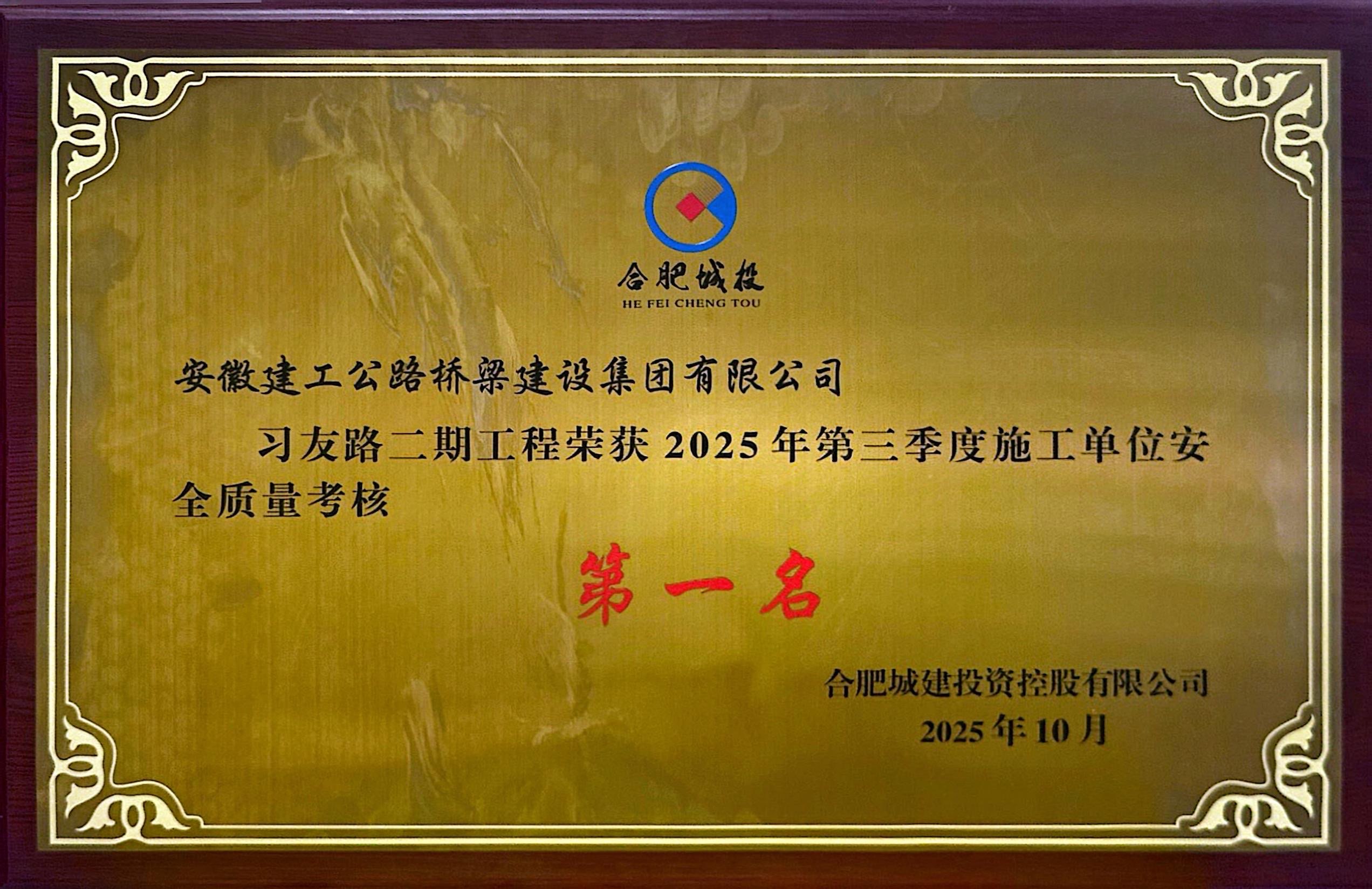 10月28日,在合肥城投組織的三季度安全生產(chǎn)表彰大會(huì)上,公司承建的習(xí)友路二期項(xiàng)目憑借卓越的綜合管理成效,在考評(píng)中榮登榜首。