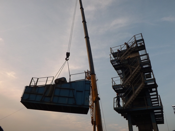 G205改建路面項(xiàng)目完成拌和站主樓吊裝 發(fā)布時(shí)間:2013年07月19日 來(lái)源:G205改建路面項(xiàng)目 發(fā)布人: 作者:楊艷峰 瀏覽:2760次 7月17日下午3時(shí),伴隨著響聲震天的鞭炮聲,兩輛大型吊車(chē)在安全技術(shù)人員和作業(yè)人員的通力協(xié)作下,安全有序地進(jìn)行拌和站主樓的吊裝。經(jīng)過(guò)全體施工人員的努力,于當(dāng)日下午6時(shí)30分完成拌和站主樓的吊裝。